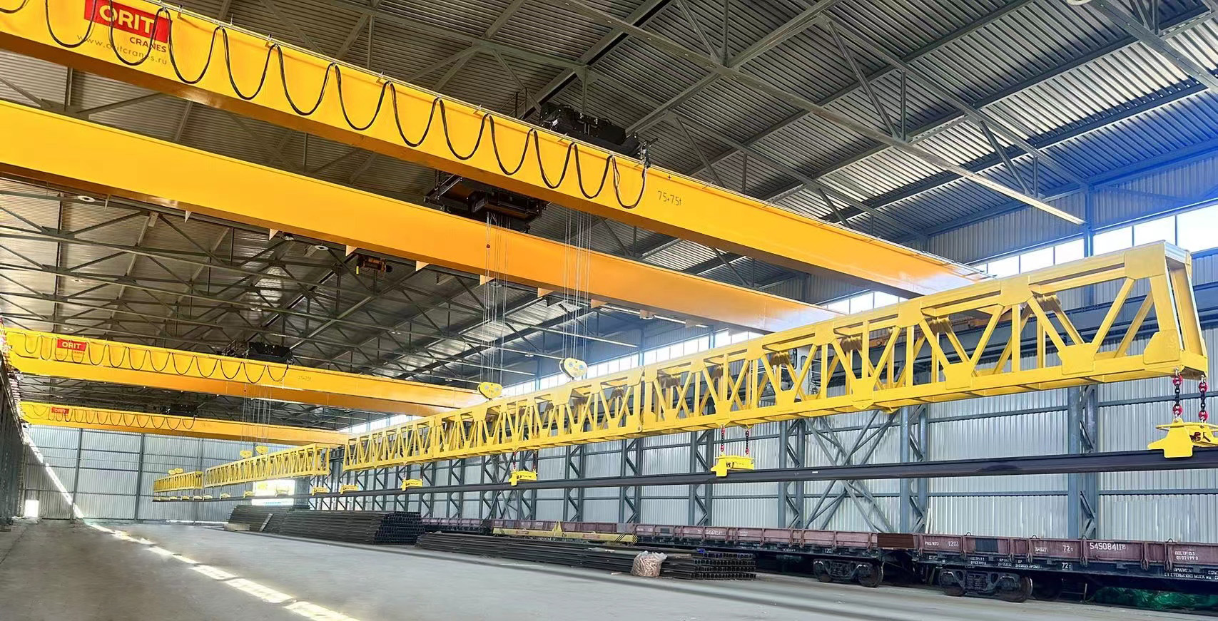 333体育长轨自动吊,三车联动定位精度高,一次性起吊多根几百米长的超长轨道,实现所有钢轨同步抓取、同步卸货,作业效率高、用工成本低。